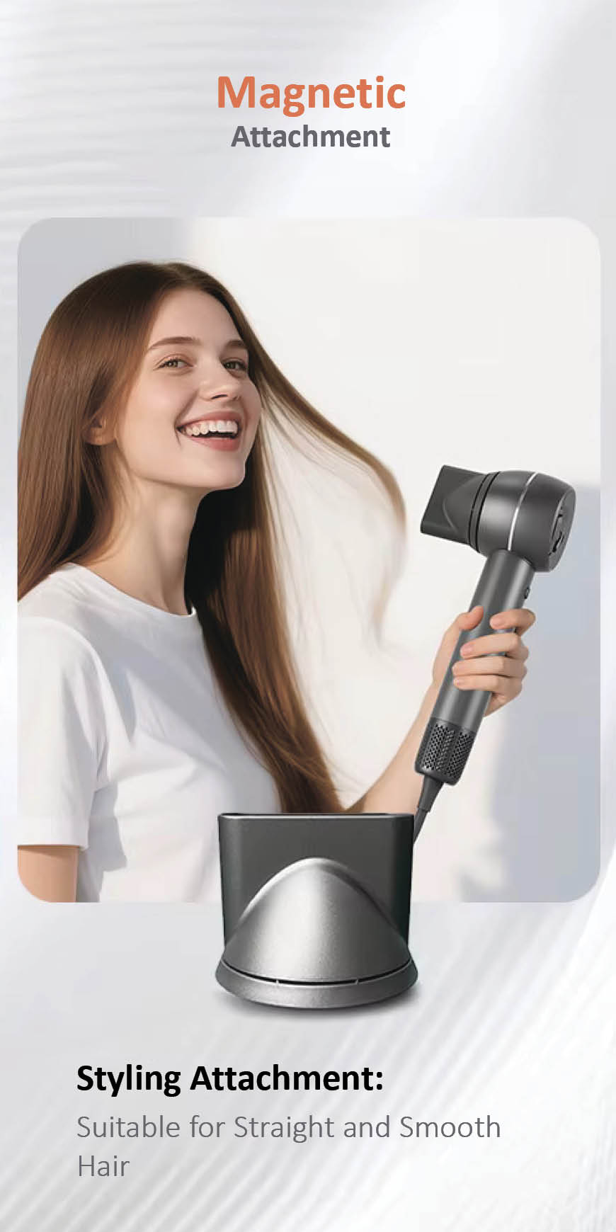 Magnetic wall mount for convenient and stylish storage, keeping your hairdryer always within reach.