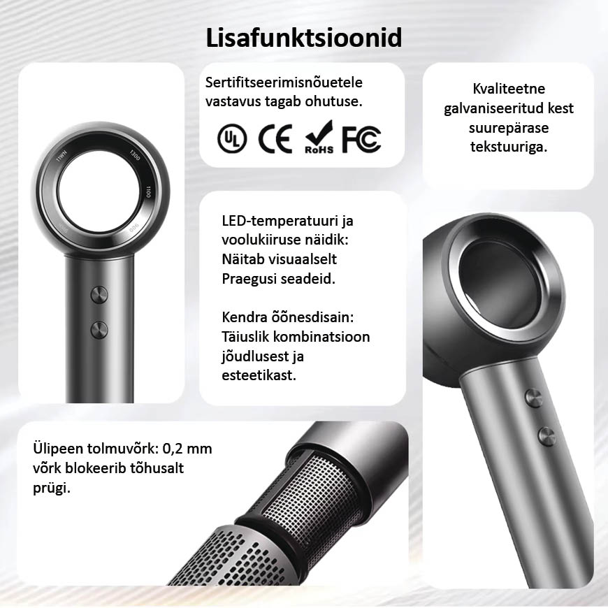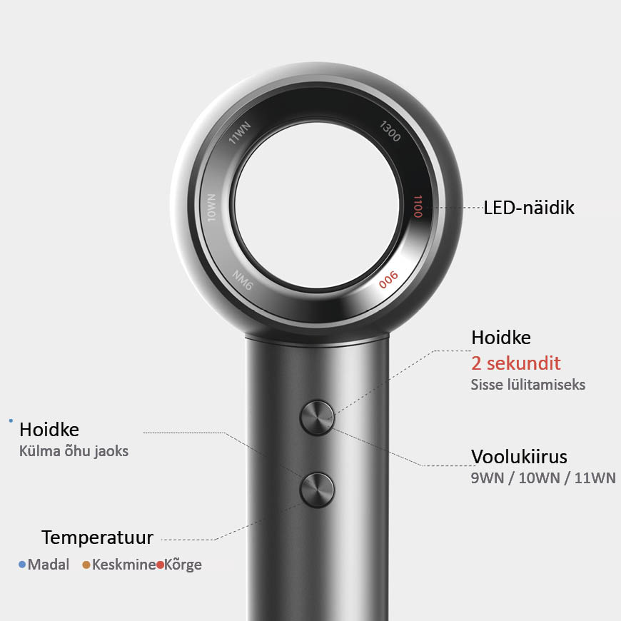 Magnetiline seinakinnitus mugavaks ja stiilseks hoiustamiseks, hoides teie fööni alati käeulatuses.